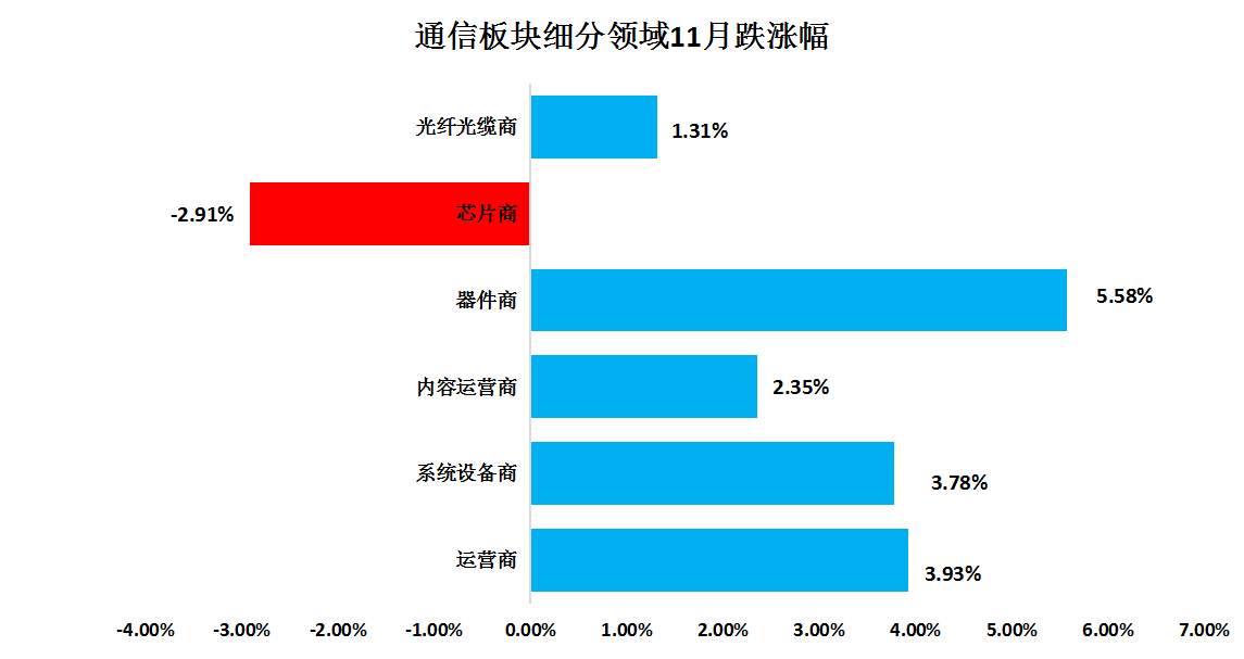 總體來看,11月通信行業(yè)平緩發(fā)展。預計器件、芯片企業(yè)仍將保持平穩(wěn)的環(huán)比需求并或在明年實現(xiàn)大幅度環(huán)比增長。