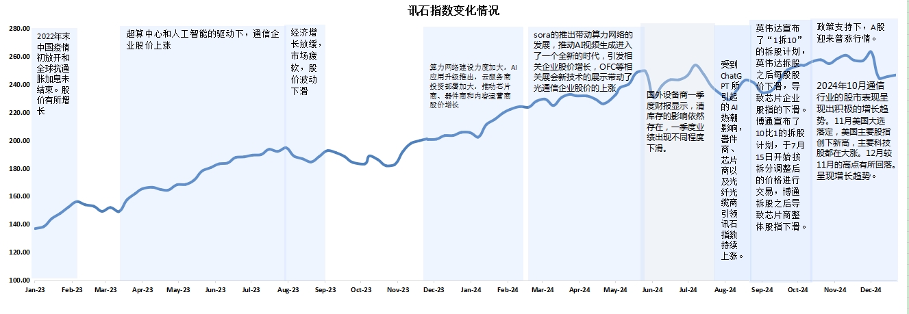 總體來看,12月通信行業(yè)股指呈現(xiàn)先下滑后增長趨勢。2025年,預計在AI的驅(qū)動下,相關(guān)企業(yè)仍將保持穩(wěn)定的需求增長,并將在技術(shù)上實現(xiàn)新的創(chuàng)新突破。