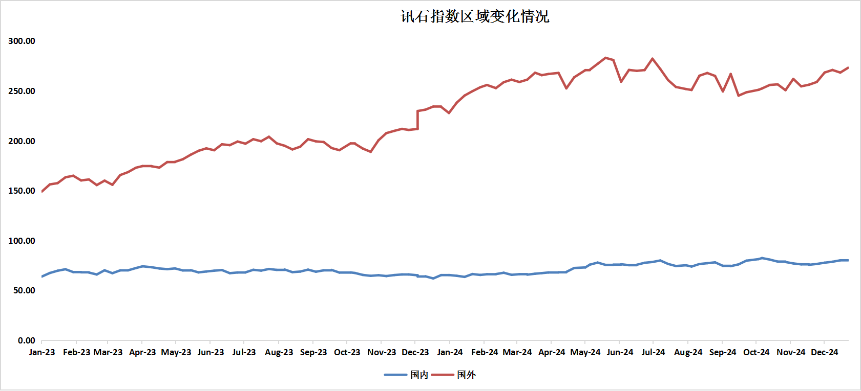 按地區(qū)劃分,截止到12月27日,ICC所統(tǒng)計的國內(nèi)通信指數(shù)為80.54,環(huán)比增長5.34%。國內(nèi)指數(shù)呈現(xiàn)平穩(wěn)趨勢。國外通信指數(shù)為273.13,較上月增長5.5%。國外指數(shù)呈現(xiàn)增長趨勢。
