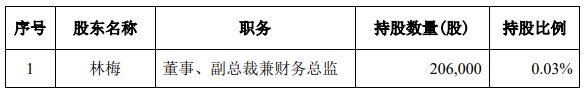 公告指出,減持原因?yàn)?strong>個(gè)人資金需求,股份來源為通過證券交易系統(tǒng)集中競價(jià)方式自二級市場買入的股份。截至目前,林梅持股數(shù)量20.6萬股,占總股本比例為0.03%