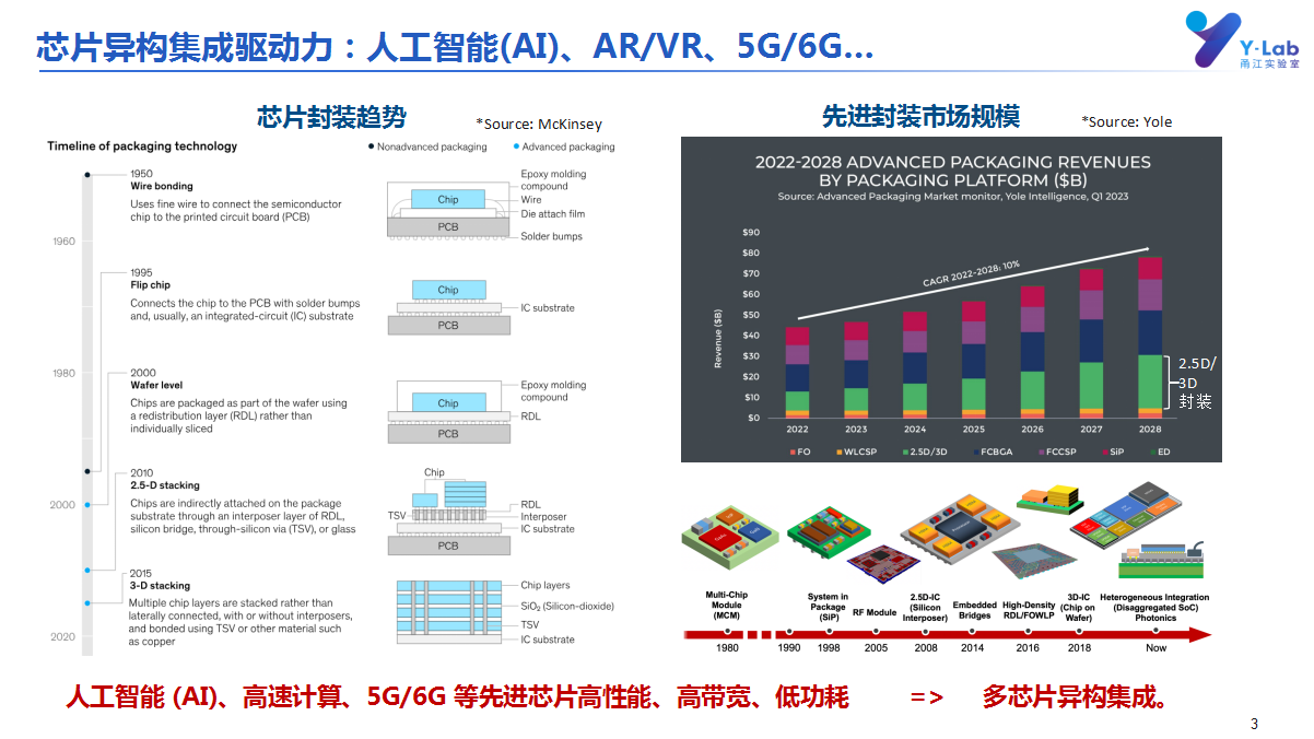 隨著人工智能、高速計算、5G/6G等應用場景的不斷深化,先進封裝技術(shù)呈現(xiàn)出明顯的發(fā)展趨勢:先進芯片向著高性能、高帶寬、低功耗方向演進,推動多芯片異構(gòu)集成成為產(chǎn)業(yè)必然選擇。