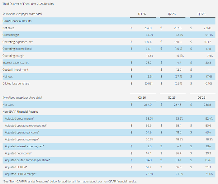 本季度銷售額為2.670億美元,較去年同期的2.368億美元增長13%,環(huán)比上一季度的2.576億美元也有所提升。GAAP毛利率為51.9%,高于去年同期的51.1%;Non-GAAP調(diào)整后毛利率為53.0%,同比從52.4%上升。凈虧損為290萬美元,較去年同期的760萬美元虧損和上一季度的2710萬美元虧損有所收窄;GAAP稀釋每股虧損為0.03美元,去年同期為0.10美元,上一季度為0.31美元。Non-GAAP調(diào)整后凈利潤為4410萬美元,上一季度為3670萬美元,去年同期為2030萬美元;調(diào)整后稀釋每股收益為0.48美元,去年同期為0.26美元,上一季度為0.41美元。調(diào)整后EBITDA為6270萬美元,環(huán)比上一季度的5650萬美元和去年同期的5110萬美元增長;調(diào)整后EBITDA利潤率為23.5%,去年同期為21.6%,上一季度為21.9%。