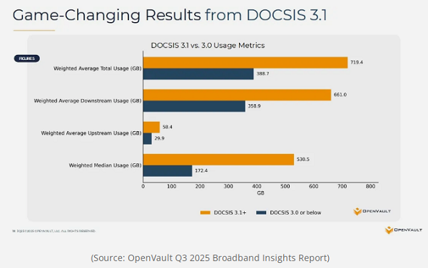 OpenVault在報告中指出:“雖然整體消費增長不再以行業(yè)周期早期所見的速度加速,但仍保持韌性。這表明平均寬帶使用量已進入一個更穩(wěn)定但仍處于擴張的階段——這與DOCSIS 3.1覆蓋范圍的擴大以及500 Mbps以上服務(wù)等級的普及相一致。”