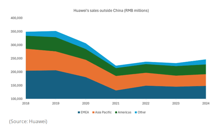 華為將大部分下降歸咎于消費(fèi)電子產(chǎn)品銷售的暴跌,制裁導(dǎo)致其無法獲得芯片和谷歌軟件對此造成了更嚴(yán)重的影響。不過該公司承認(rèn),在實(shí)施限制的國家,網(wǎng)絡(luò)銷售額也有所萎縮。這顯然包括英國,報告顯示華為在該國收入從2018年的12.4億英鎊(16.4億美元)降至去年的1.882億英鎊(2.486億美元)。盡管如此,EMEA 地區(qū)整體銷售額自2021年以來已有所上升,去年收入比2023年增長了2%。